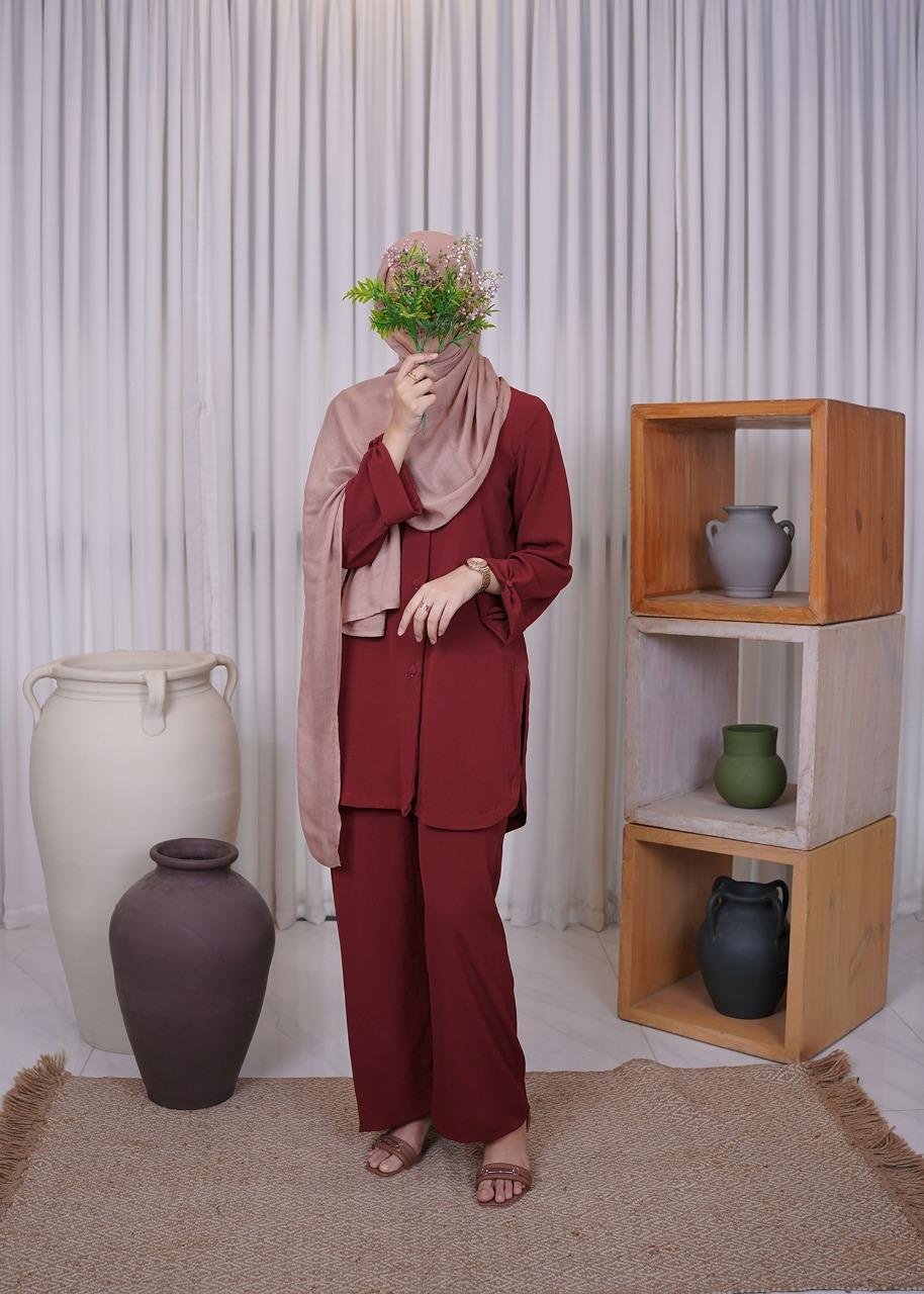This minimalist two-piece co-ord set is a staple for modest everyday wear, offering a streamlined and effortlessly put-together look. The set is designed with a focus on comfort and a clean, monochromatic aesthetic.