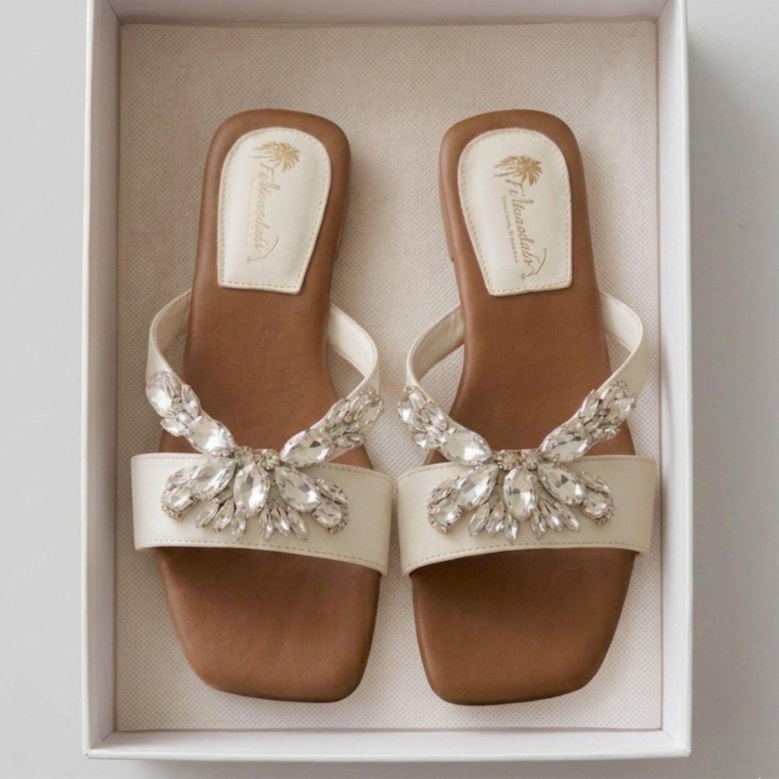 Designed for the modern woman who values both style and comfort, these flats feature a delicate, shimmering butterfly-inspired motif crafted from high-quality faux crystals. The soft cream-colored straps contrast beautifully with the rich tan footbed, making them a versatile choice for everything from festive gatherings to elevated daily wear.