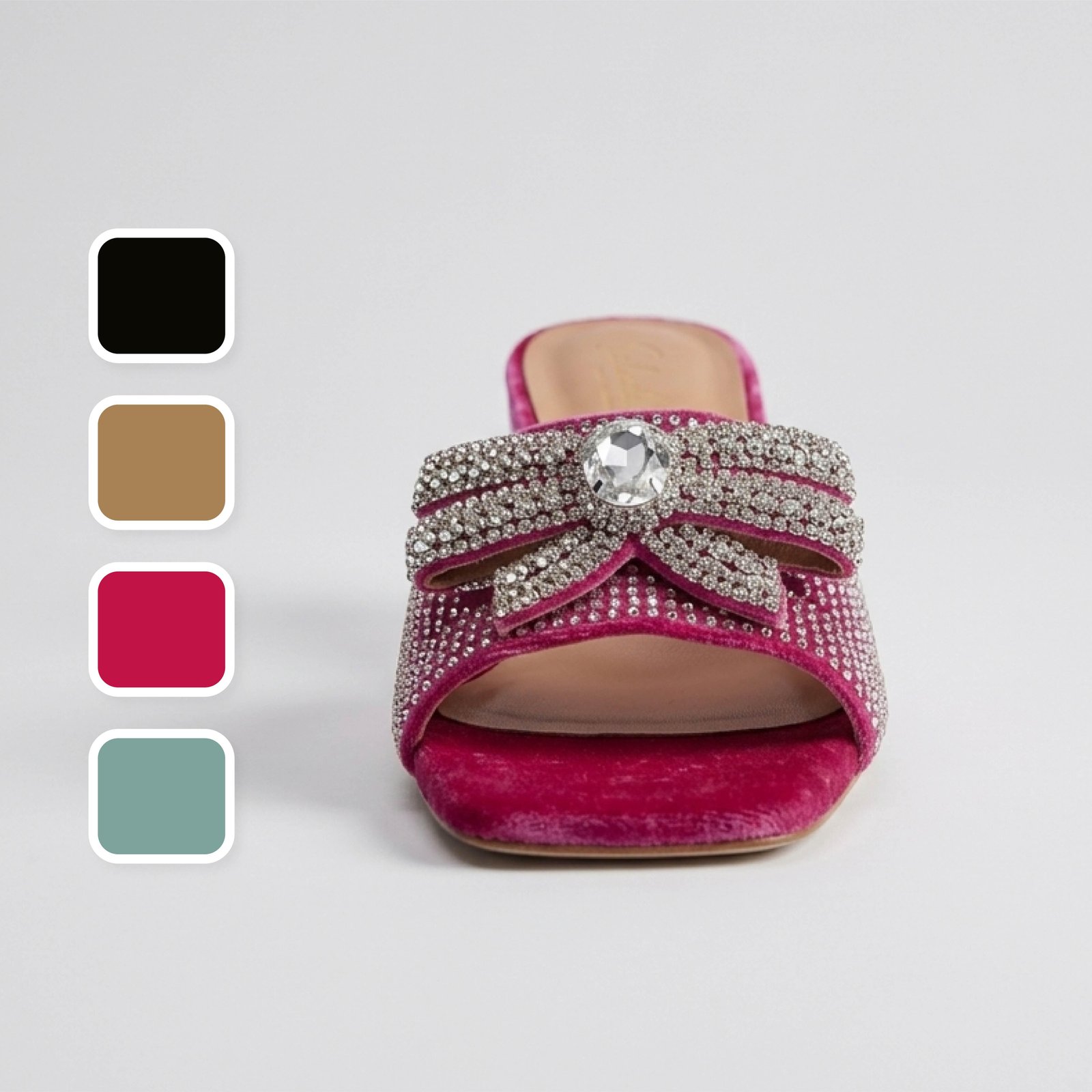- Heel: A comfortable low-to-mid block heel, also wrapped in matching velvet and crystals.