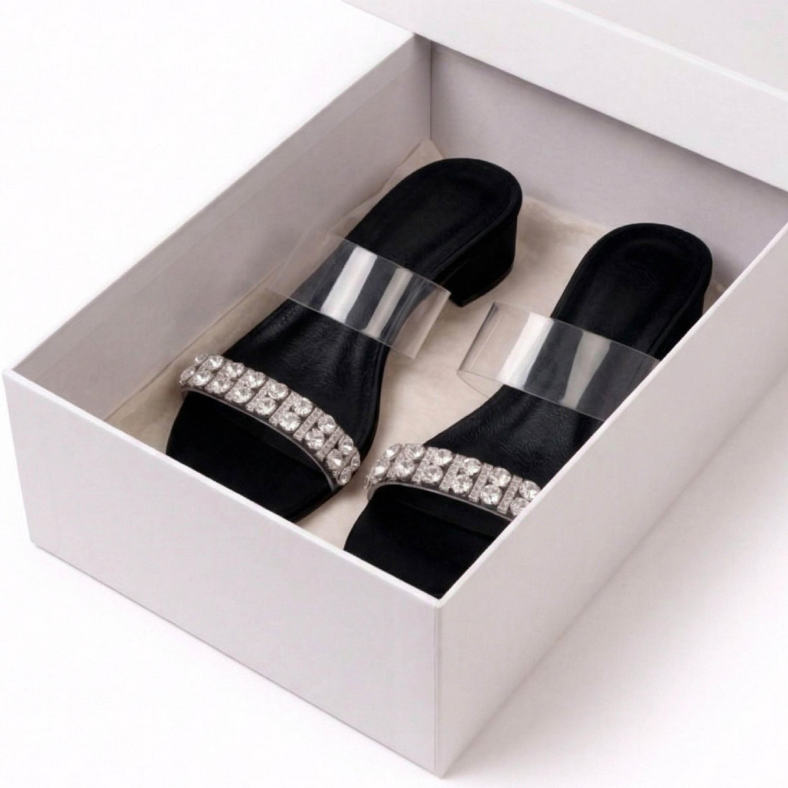 - Premium Finish: A smooth black cushioned insole offers a sophisticated contrast to the clear straps and sparkling details.