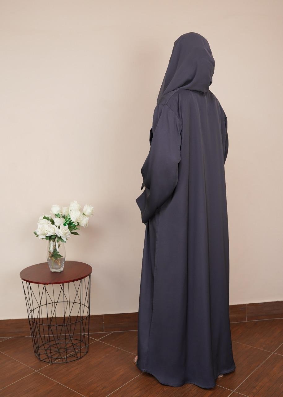 - Modern Contrast Lapels: Wide, slate grey front panels create a vertical lengthening effect, adding a contemporary twist to the classic abaya.