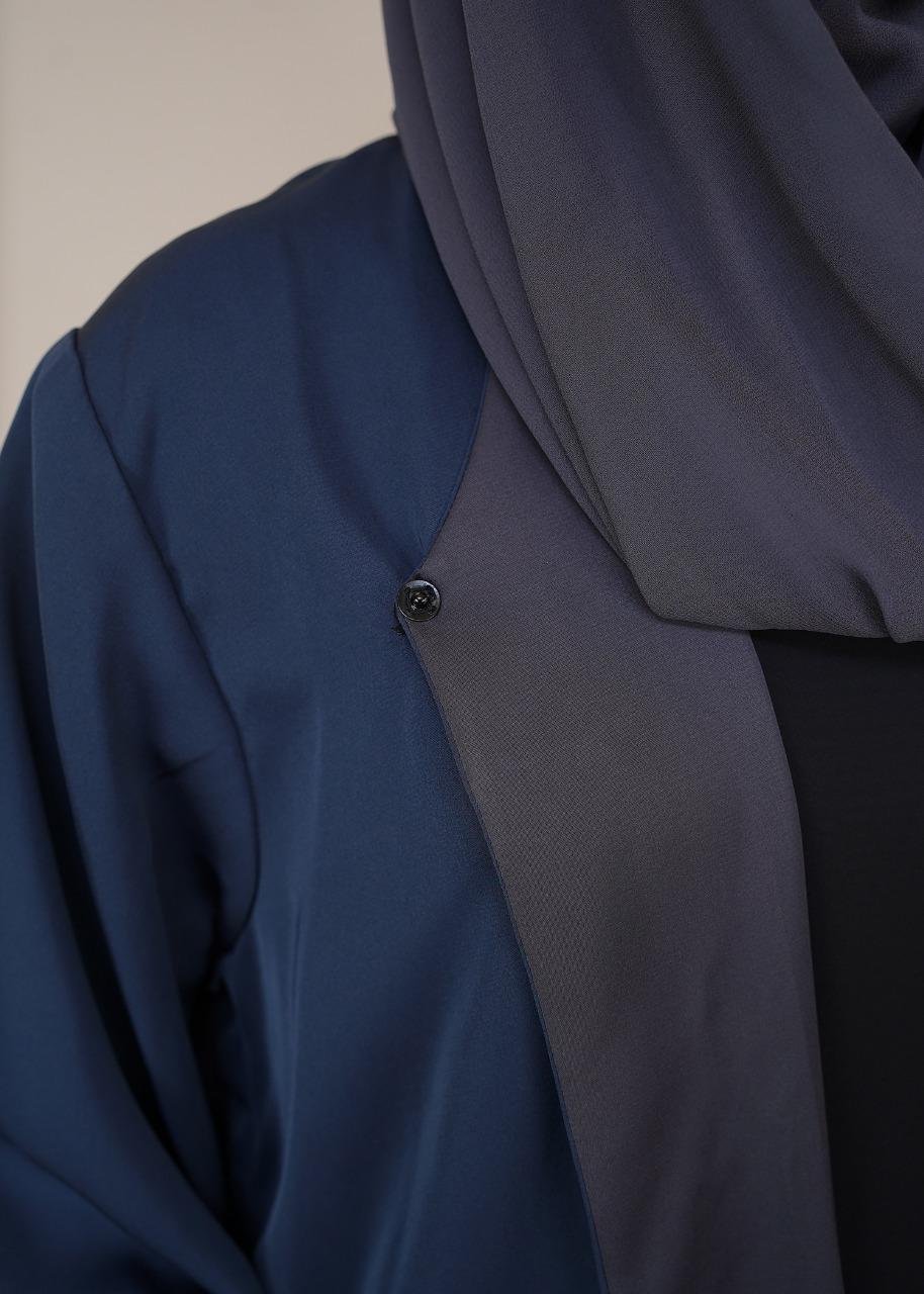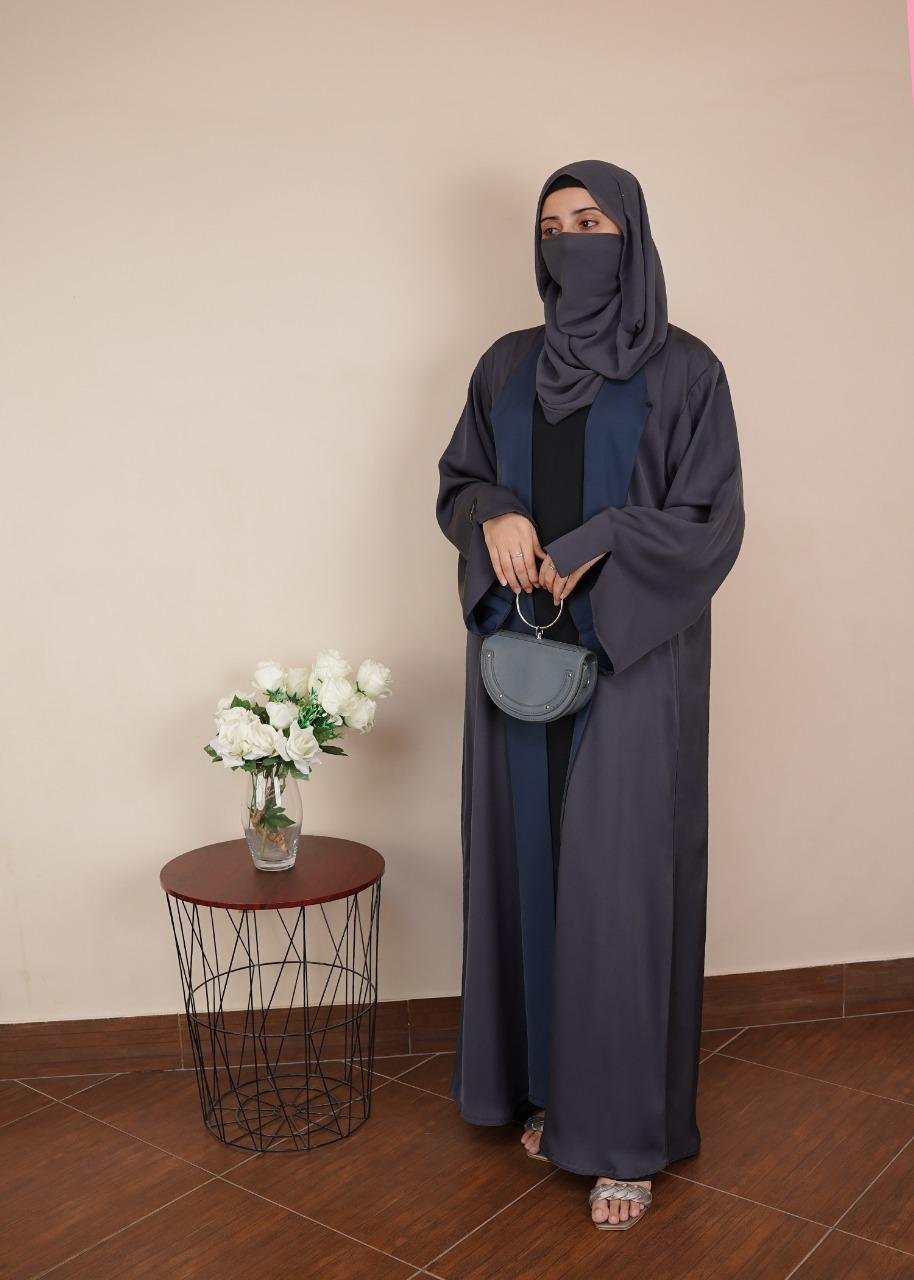 Elevate your modest wardrobe with our Dual-Tone Contrast Open Abaya, a masterpiece of minimalist design and modern tailoring. This open-front silhouette features a striking color-block aesthetic, pairing a rich midnight blue body with sophisticated slate grey lapels. Designed for effortless layering, this abaya offers a clean, architectural look that transitions seamlessly from casual daytime wear to elegant evening events.